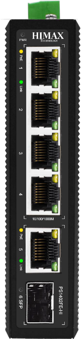 HIMAX PS1402FG-I (4GE+1GE+1GE) - гігабітний некерований промисловий PoE комутатор на 4*10/100/1000Base-T PоE порту та 1*1000M RJ45 порт та 1*100/1000Base-X SFP порт. Порти 1-4 підтримують IEEE 802.3af/at стандарт PoE, навантаження на кожен порт може досягати 30W, максимальна вихідна потужність по PoE - 60W (для 802.3at - 120W). Підтримує AI Watchdog, самовідновлення портів, VLAN, збільшення відстані до 300 метрів, автоматичну зміну швидкості, пріоритетного порту. Підвищений грозо- та пиловологозахист. Живлення - 48-57VDC через 5P промисловий phoenix-термінал, захист від переполюсування, БП у комплект не входить. Підходить для використання на транспорті, в електроенергетиці, гірничо- та нафтовидобувній промисловості, у морському транспорті та інших промислових областях