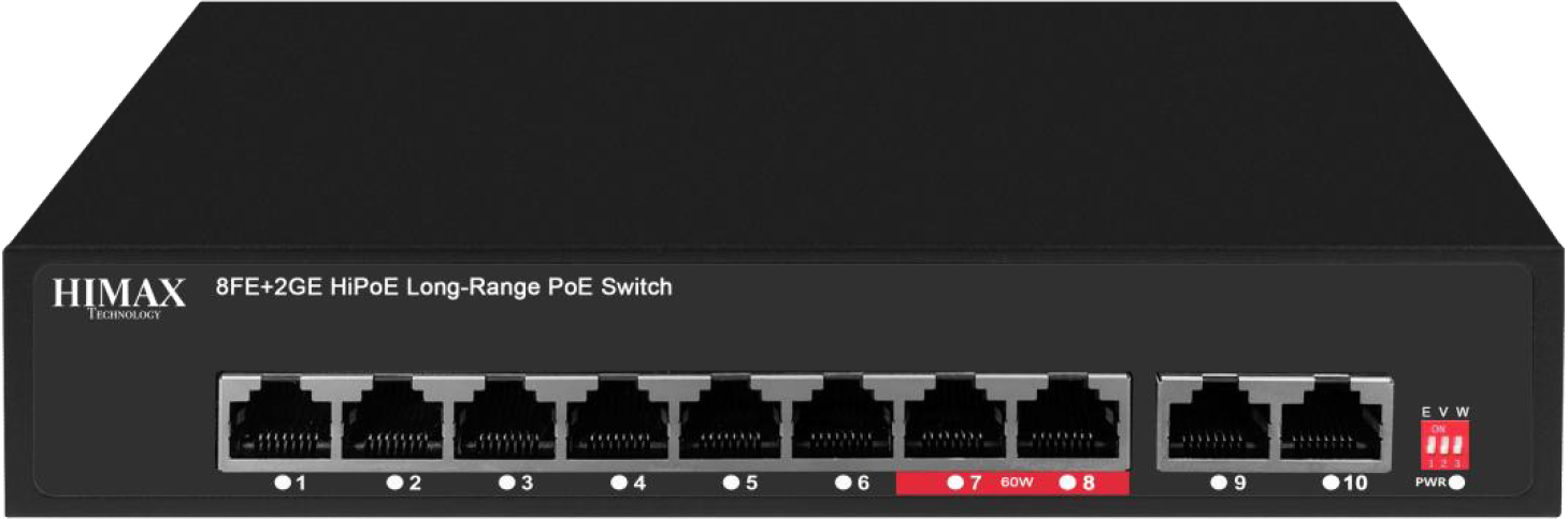 HIMAX PS1802GE (8FE+2GE) - некерований комутатор PoE 10/100M. Має 8*10/100M портів PoE і 2*10/100/1000M портів RJ45 вихідного зв’язку. Порти 1-8 можуть підтримувати IEEE 802.3af/при стандартному джерелі живлення PoE. Потужність одного порту PoE на портах 1-6 досягає 30 Вт, потужність PoE на одному порту на портах 7-8 досягає 60 Вт. Максимальна вихідна потужність PoE становить 120 Вт. Як пристрій живлення PoE, він може автоматично виявляти та розпізнавати обладнання, що отримує живлення, яке відповідає стандарту, і подавати живлення через мережевий кабель.