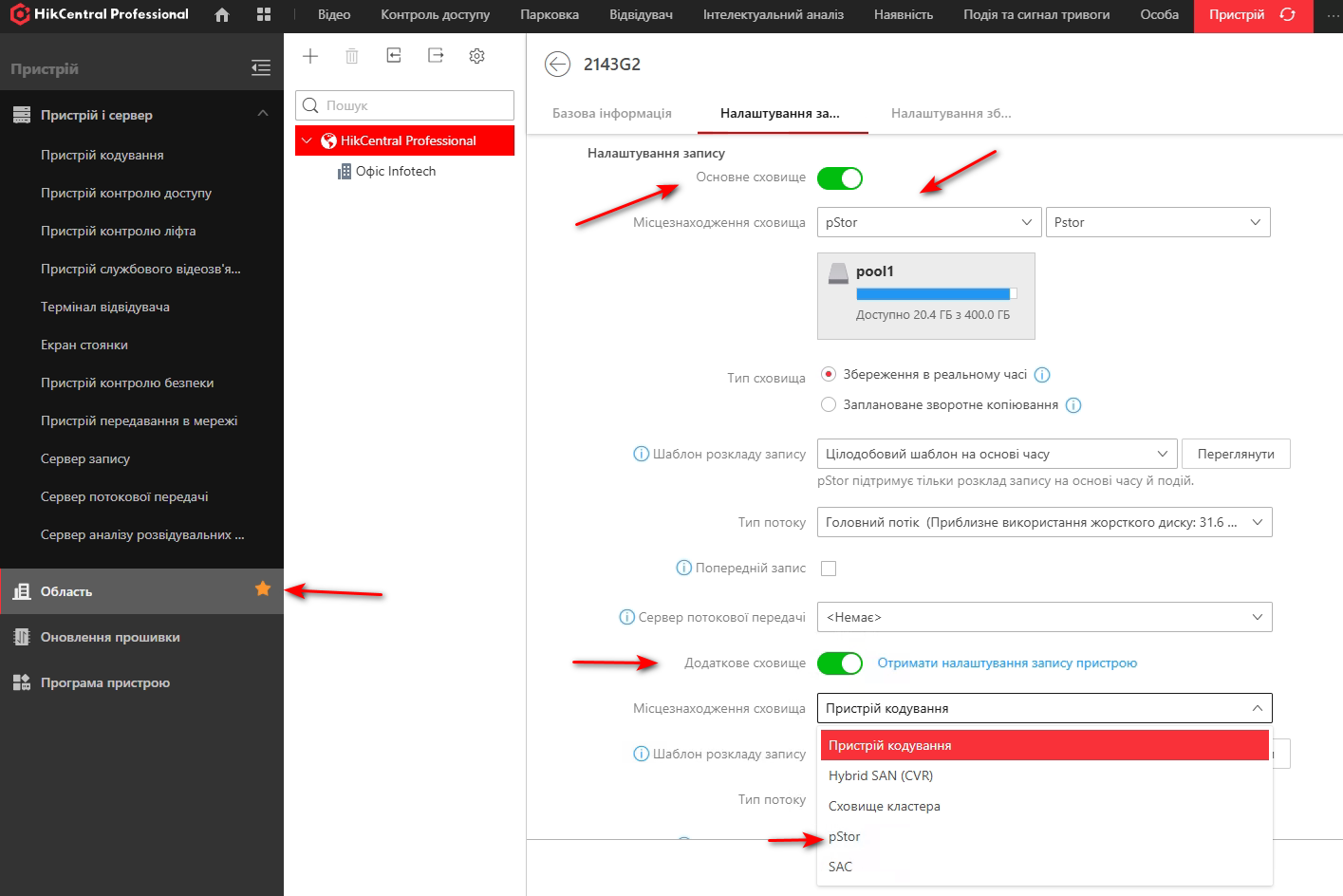 Устройство → Область → выберите камеру и установите pStore в качестве основного или дополнительного хранилища.