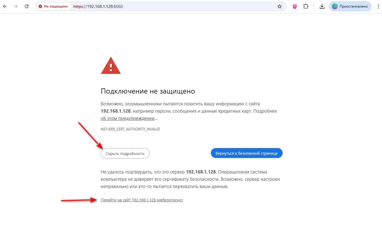 Игнорируйте предупреждения браузера о безопасности и откройте страницу входа в pStore.