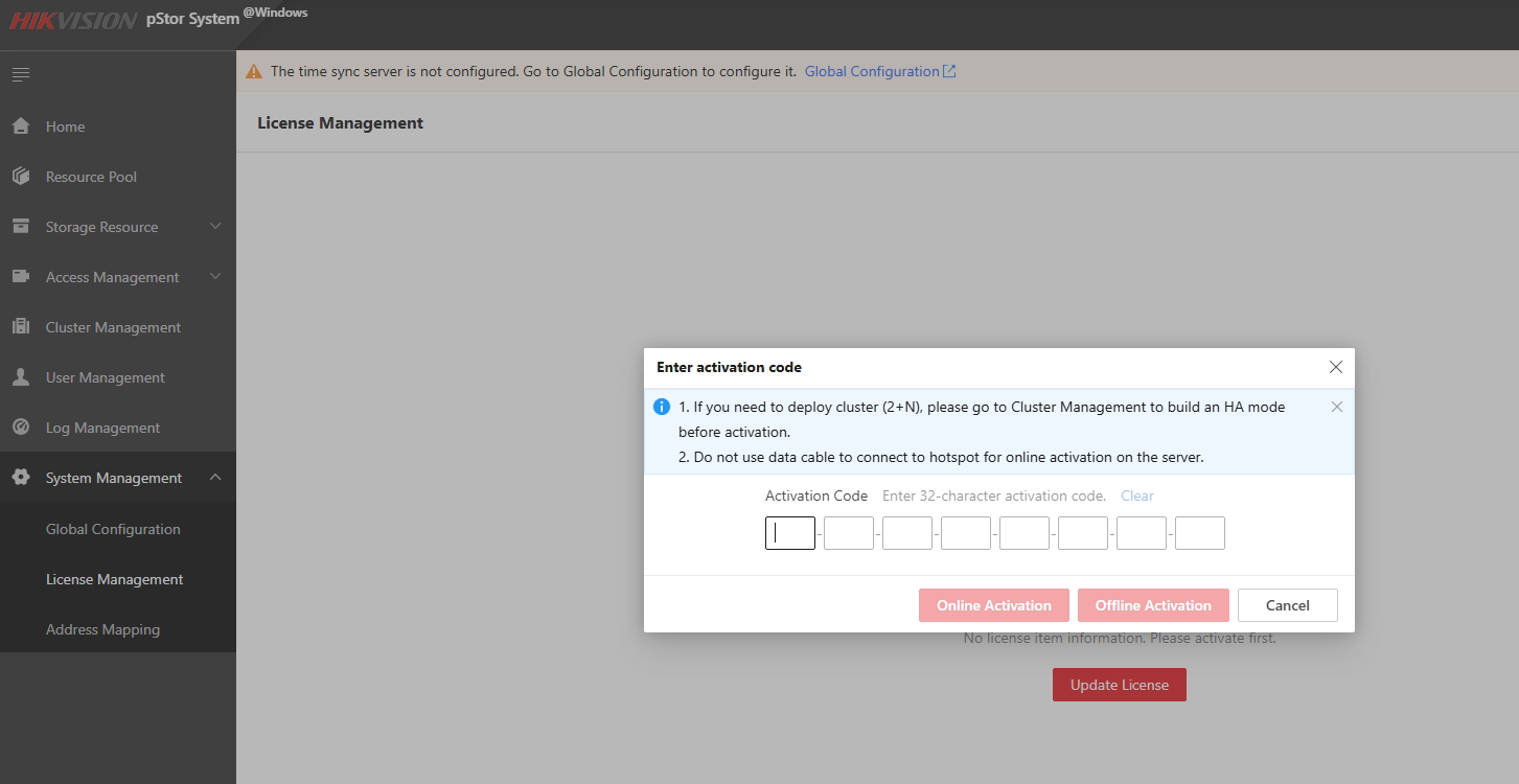 Офлайн активация — после нажатия кнопки понадобится компьютер с доступом к Интернету и флеш-накопитель. Необходимо экспортировать файл, передать его на другой ПК с доступом в Интернет, загрузить на сервис https://kms.hikvision.com/active, выполнить активацию, а затем импортировать полученный файл обратно на сервер pStore.