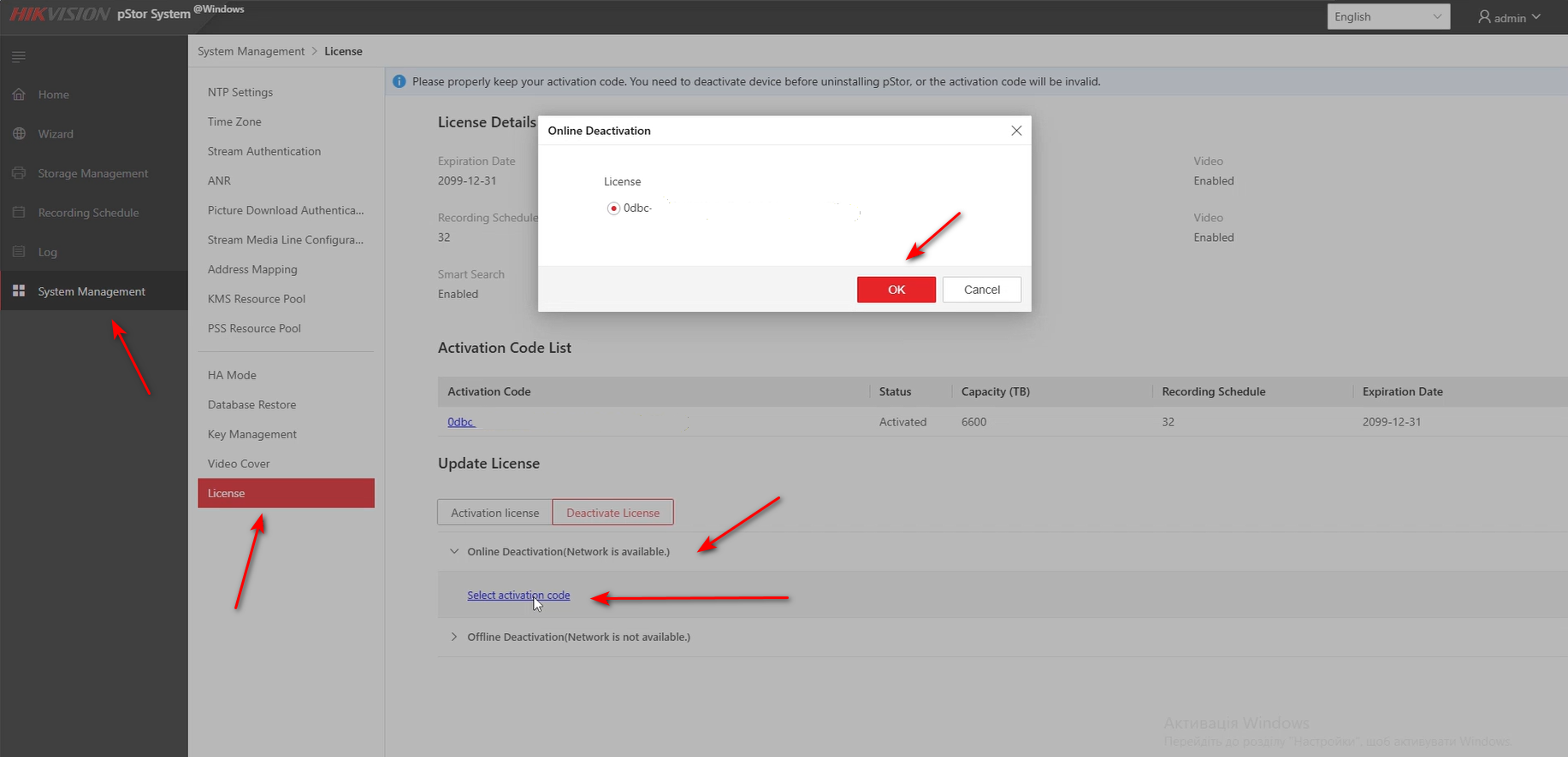 Офлайн активация— потребуется компьютер с доступом в Интернет и флеш-накопитель. Необходимо экспортировать файл, передать его на другой ПК с доступом в Интернет, загрузить на сервис https://kms.hikvision.com/deactive, выполнить деактивацию, а затем импортировать полученный файл обратно на сервер pStore.