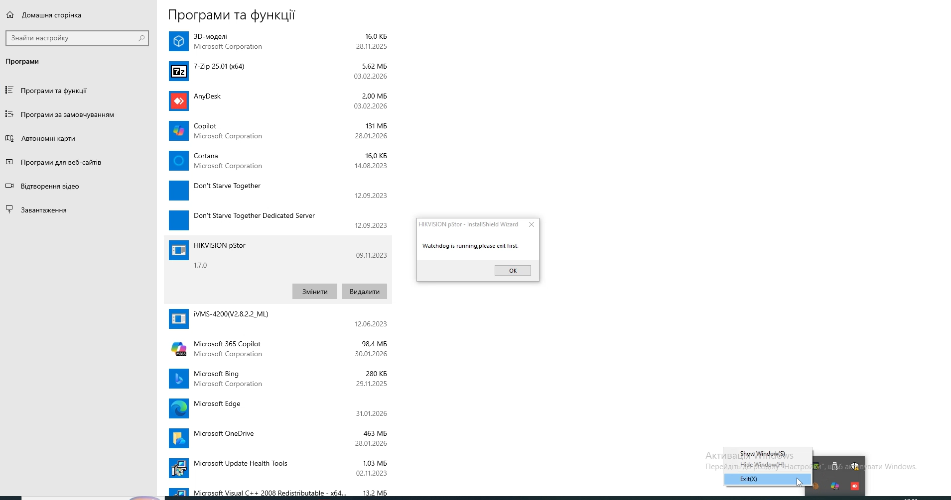 После остановки Watchdog закройте его в системном трее Windows, чтобы избежать ошибок при удалении.