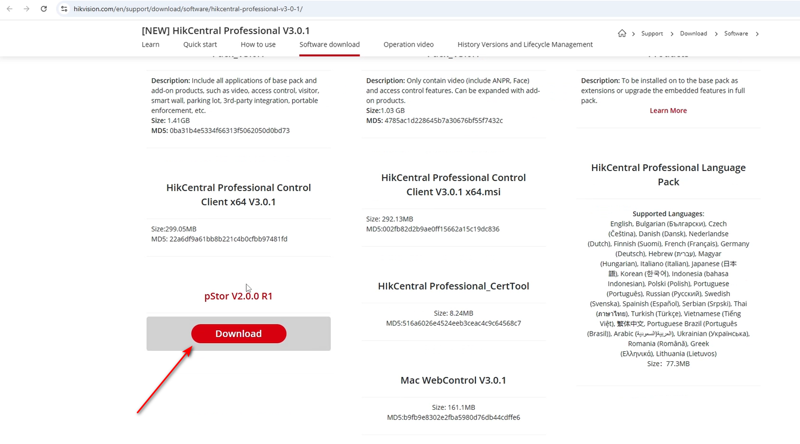 Найдите свою версию HikCentral Professional, откройте страницу загрузки, выберите pStore и загрузите его.