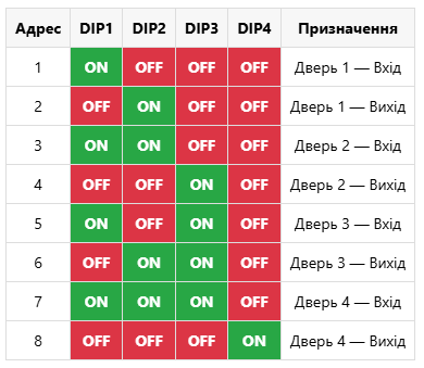 Таблица адресации для DIP-переключателей на считывателях по RS-485