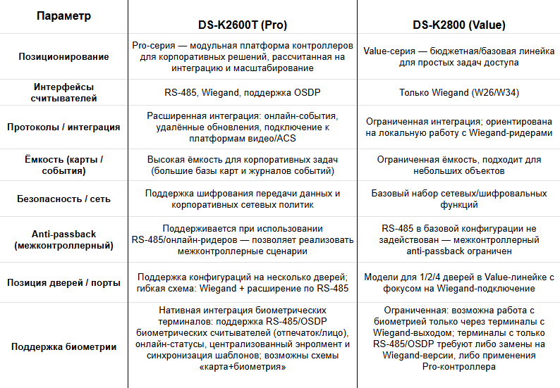 Контроллеры доступа Hikvision: интерфейсы и ограничения DS-K2600/DS-K2800