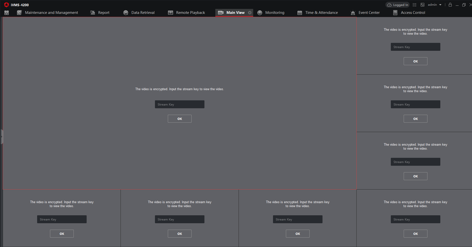 Якщо на камері або реєстраторі увімкнено опцію Video Encryption, то при перегляді онлайн або відтворенні архіву iVMS-4200 вимагає введення Stream Key для кожного каналу окремо.