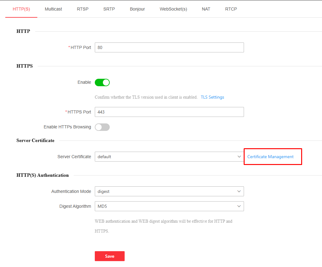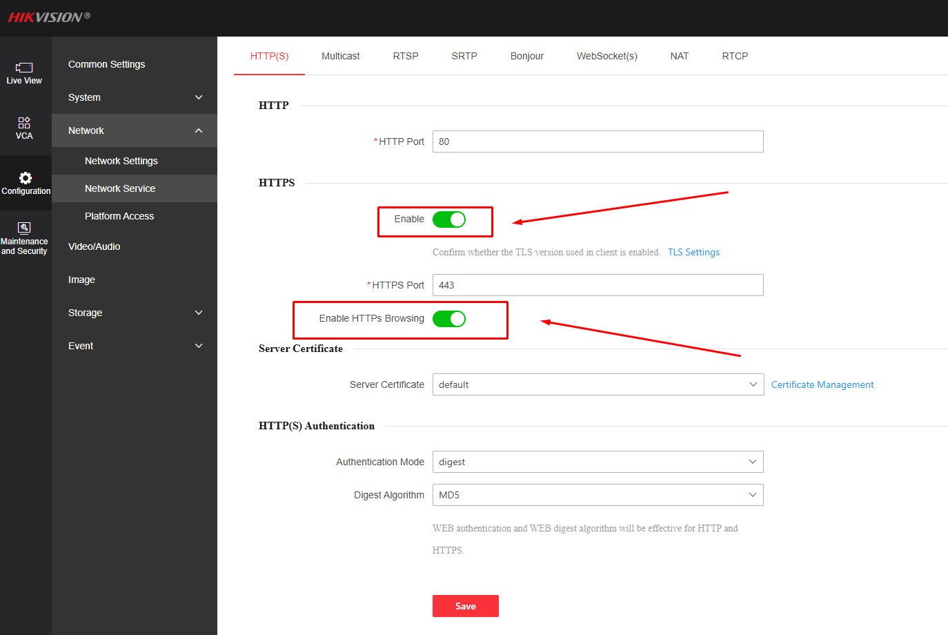 Configuration → Network → Advanced Settings/Network Service → HTTPS