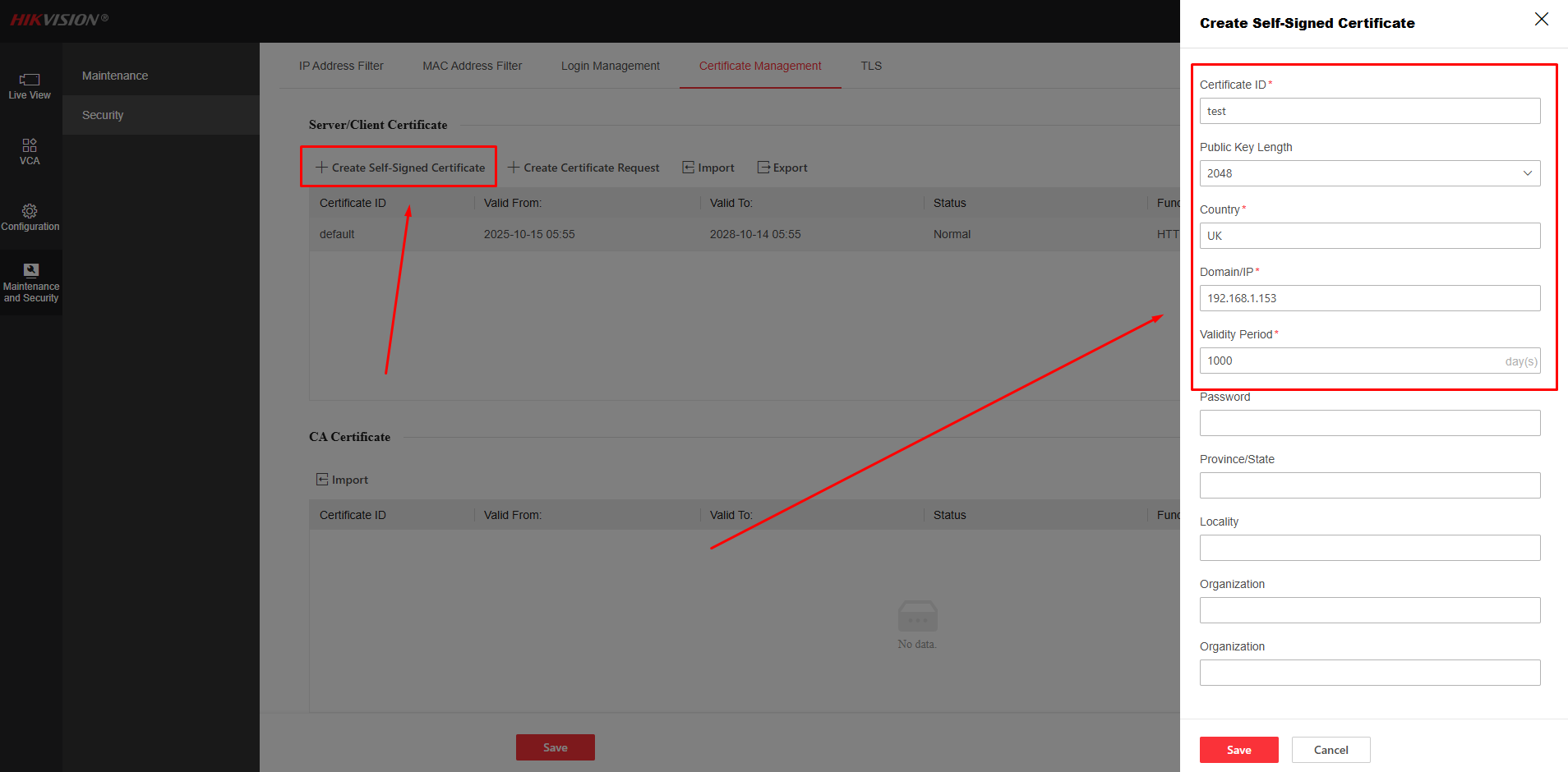 - Якщо ви згенерували ключ і сертифікат на іншому хості (OpenSSL, корпоративний PKI-шаблон тощо), його можна імпортувати в камеру/NVR.