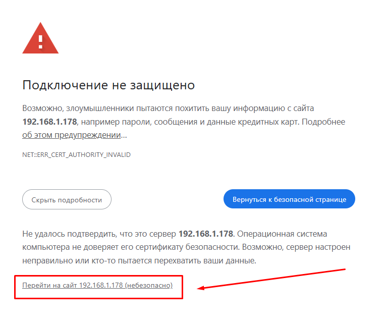 - Браузер лається: «Ненадійний сертифікат», тому що сертифікат не підписаний зовнішнім центром.