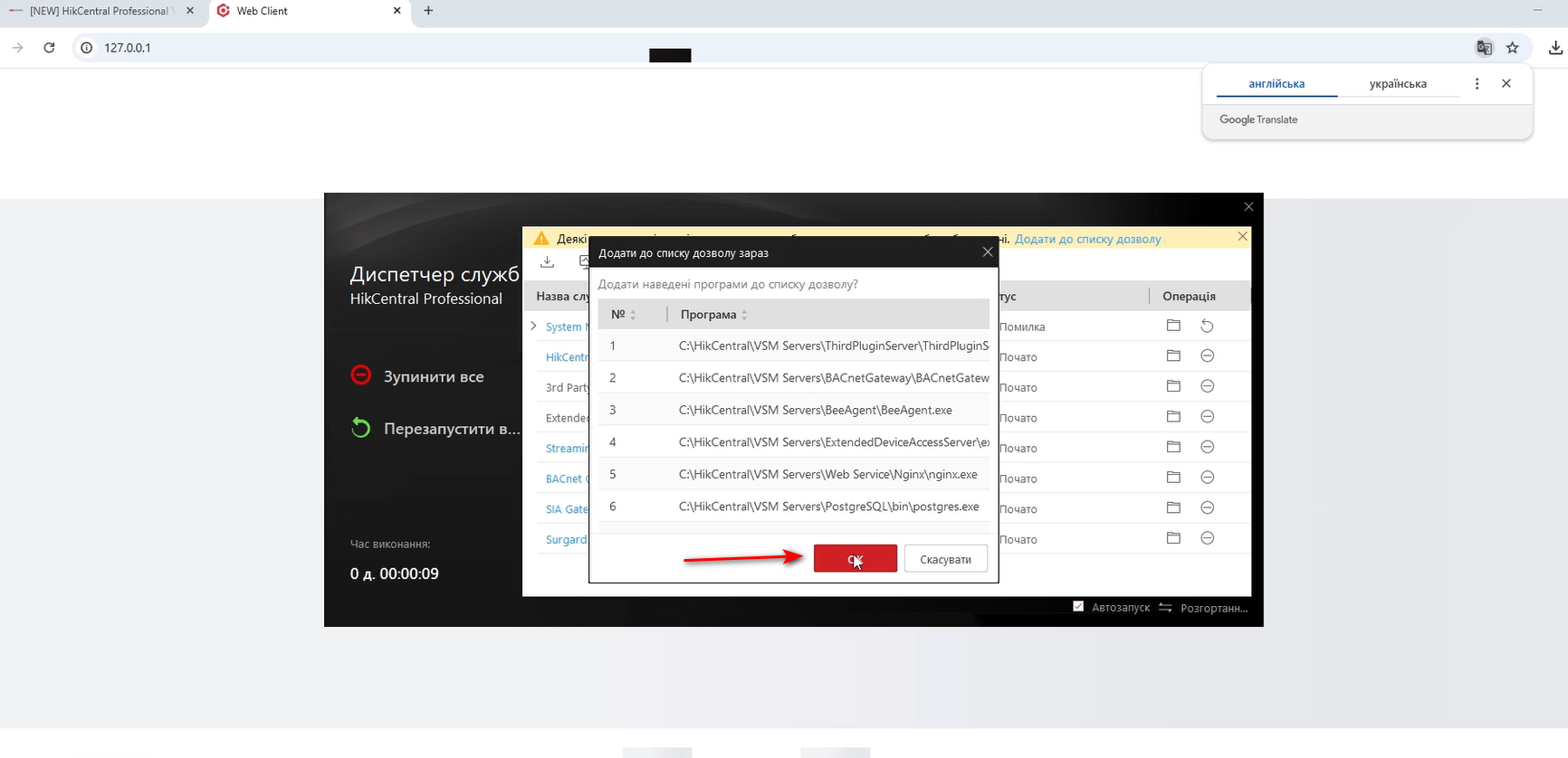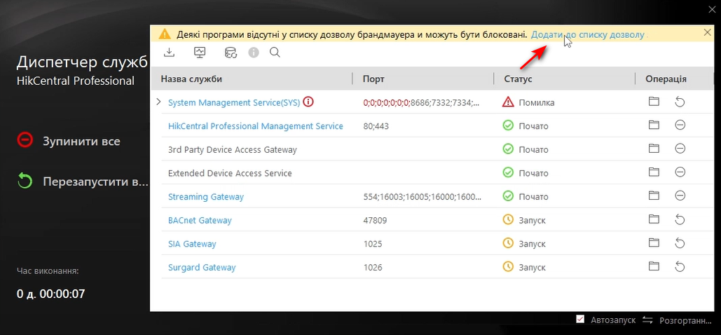 В Диспетчері служб HikCentral Professional натискаємо |Додати до списку дозволів|, щоб брандмауер Windows не заважав роботі служб і не було помилок.