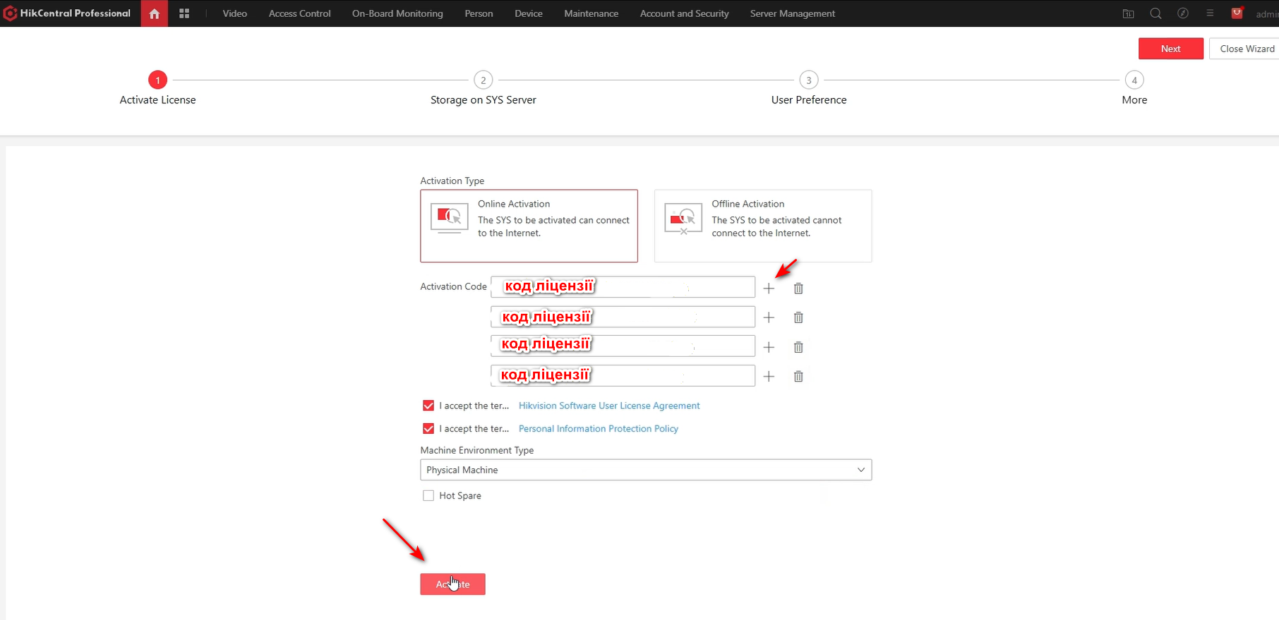 Наступним кроком ми обираємо Онлайн активацію ключів ліцензій, і вводимо наші коди ліцензій в поля Activation Code.