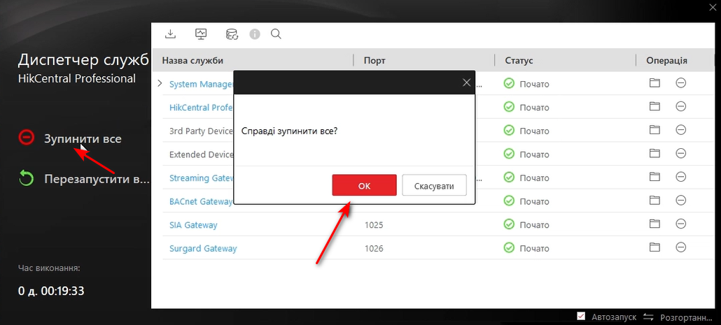 В Диспетчері служб HikCentral Professional натискаємо |Зупинити все|, і підтверджуємо натискаючи |ОК| у вікні яке з'явилося.