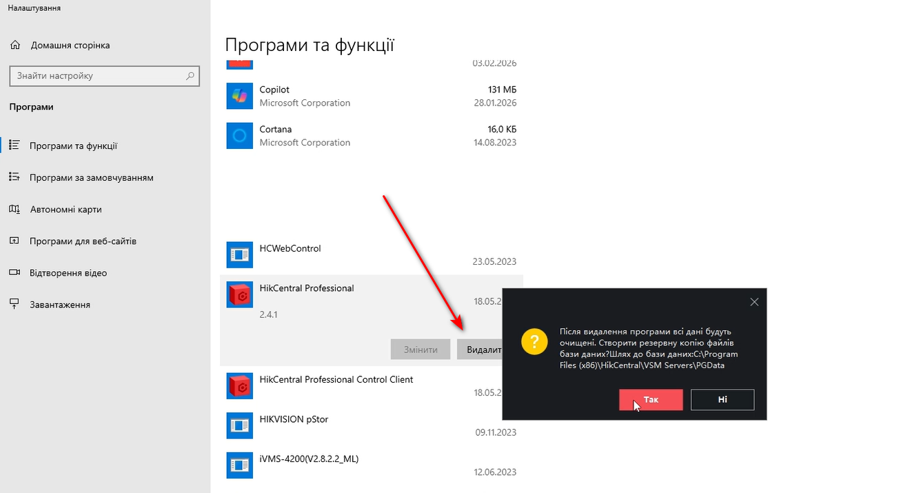 При видаленні нас запитає чи хочемо ми зробити резервну копію бази даних.