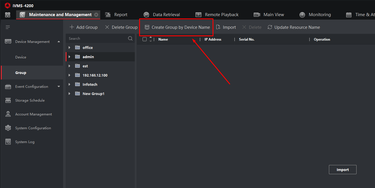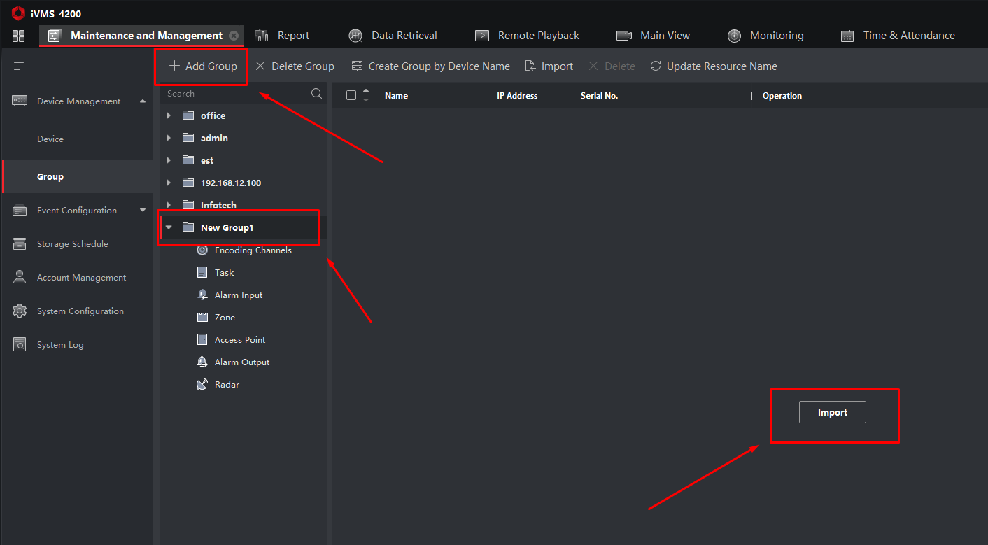 Після цього група буде порожньою — камери необхідно імпортувати. Hikvision окремо підкреслює, що після створення групи її потрібно заповнити шляхом імпорту камер.