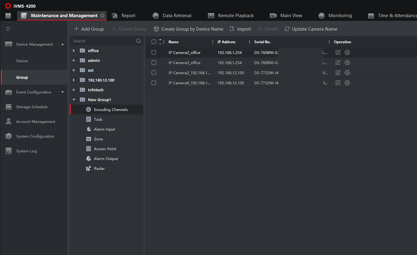 - Group → Import → Encoding Channels. Назви камер відрізняються від тих, що на реєстраторі — виконайте оновлення: