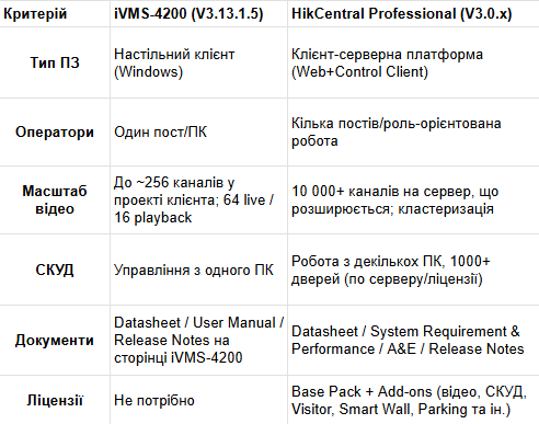 - iVMS-4200 (версія 3.13.1.5) — настільний клієнт для Windows, безкоштовний. Підходить для невеликих інсталяцій з одним адміністратором/оператором, де достатньо базового відеоспостереження та локального управління СКУД/домофонією з одного комп’ютера. Документи та дистрибутиви доступні на сторінці iVMS-4200; серед них — технічний опис (Datasheet) та нотатки випуску (Release Notes).